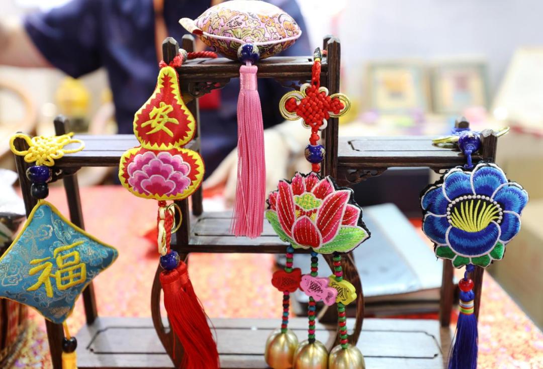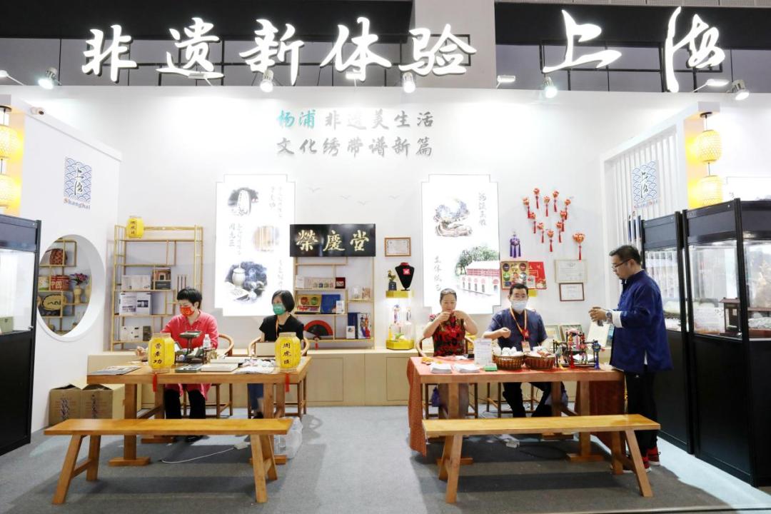 杨浦区文化和旅游局、区非遗保护分中心应邀组织区内特色非遗项目及其保护单位参展,包括周虎臣毛笔制作技艺、曹素功墨锭制作技艺(国家级);荣庆堂香囊制作技艺、中式服装盘扣制作技艺(市级);玉雕、立体纸艺(区级))。通过看、听、学的沉浸式体验互动,以场景化、生活化的方式展示非遗整体性保护成果以及非遗衍生品开发和生产性保护技术创新等特色内容。