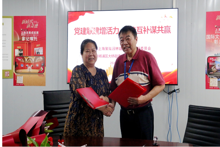 6月29日,市民营经济协会理事单位、杨浦区私协副会长单位——上海聚隆园林建设(集团)有限公司党支部与杨浦区大桥街道幸福村居民区党总支举行“党建联建增活力,优势互补谋共赢”党建结对共建签约仪式,聚隆公司相关负责人、幸福村居民区党总支委员、党员代表等参加了签约仪式与座谈会。