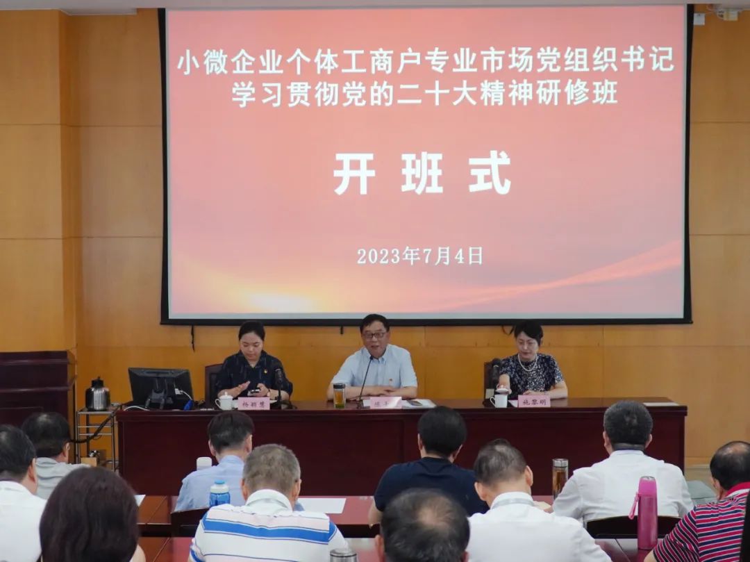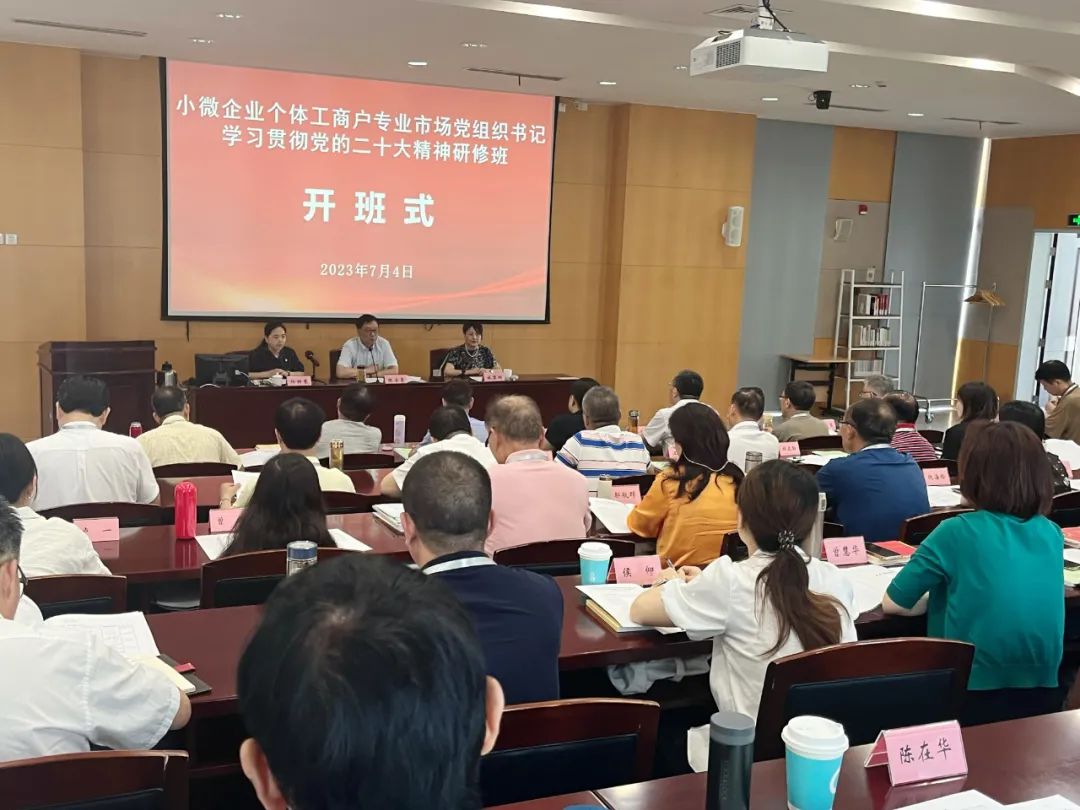 为推动全市小微企业、个体工商户、专业市场领域(以下简称“小个专”)深入学习党的二十大精神,进一步提升“小个专”党组织书记理论水平,增强做好“小个专”党建工作的责任感和使命感,7月4日上午,由上海市市场监督管理局、市民营经济协会联合举办的小微企业个体工商户专业市场党组织书记学习贯彻党的二十大精神研修班举行了开班仪式。上海市民营经济协会会长陈士豪、市市场监管局党建工作指导处处长施黎明、副处长杨颖慧出席开班仪式,各区协会党建工作负责人和“小个专”党建“薪火点”、市协会直属会员党组织负责人、党员、入党积极分子等70余位学员参加培训。