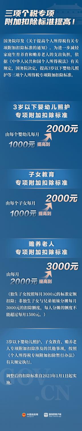 为进一步减轻家庭生育养育和赡养老人的支出负担,依据《中华人民共和国个人所得税法》有关规定,国务院决定,提高3岁以下婴幼儿照护等三项个人所得税专项附加扣除标准。现将有关事项通知如下: