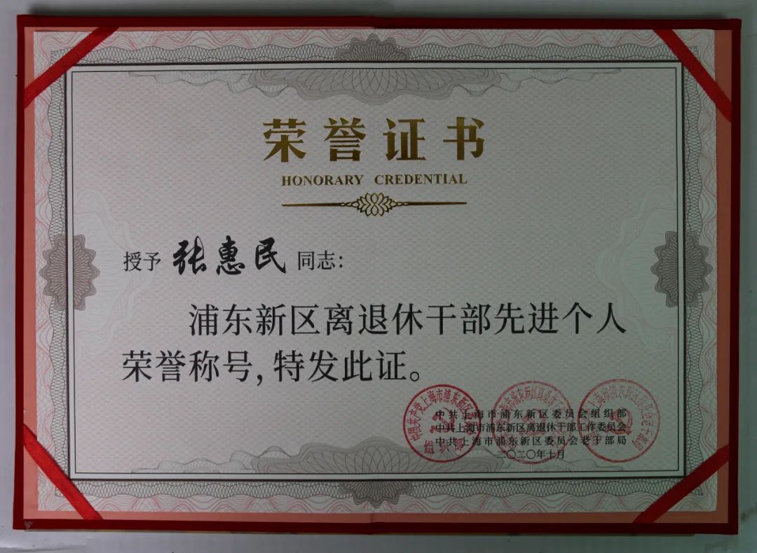 这年岁末,他被浦东新区区委组织部、离退休干部工委及区委老干部局授予“浦东新区离退休干部先进个人”荣誉称号。