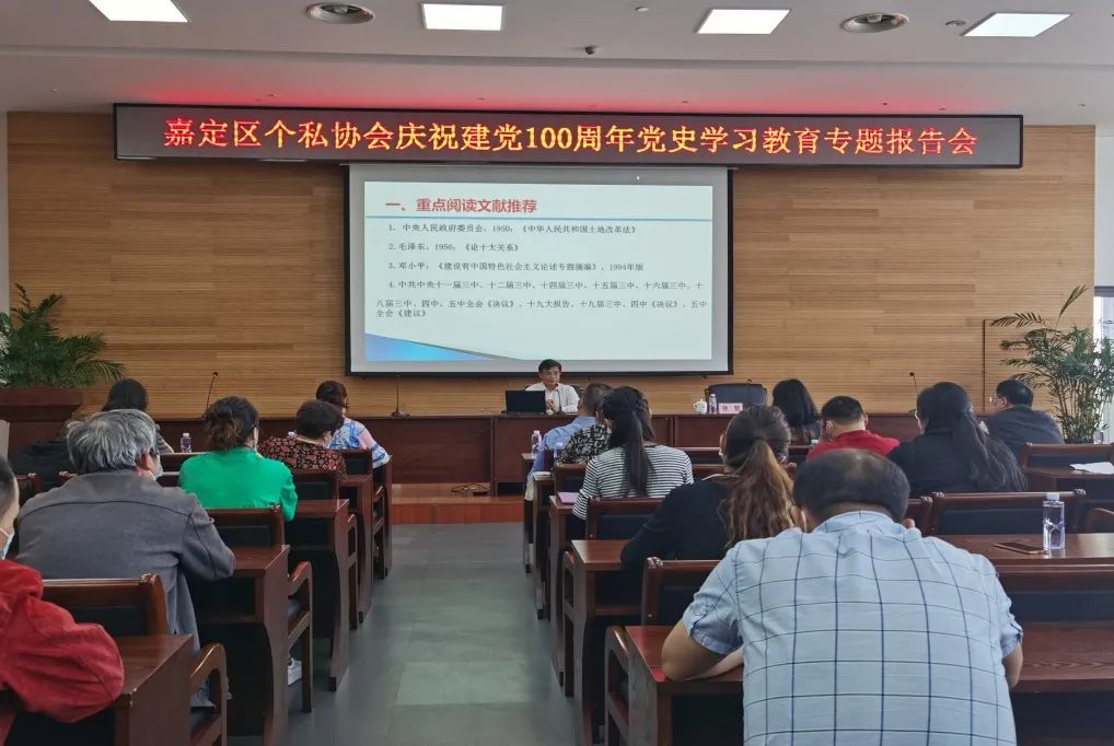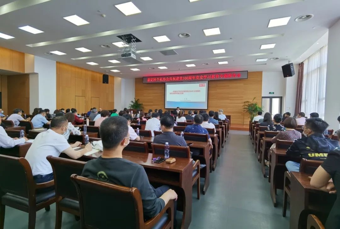 为庆祝建党一百周年,深入推动个私协会系统党史学习教育走深走实,深化对民营经济人士理想信念的教育,5月24日下午,嘉定区个私协会特邀复旦大学公共经济研究中心主任、教授石磊作《中国共产党对经济发展道路的艰苦探索及其理论总结》党史学习教育专题报告会。区个私协会长、副会长、常务理事、理事、党建联系点支部书记、部分企业会员以及协会工作人员等120余人参加会议。