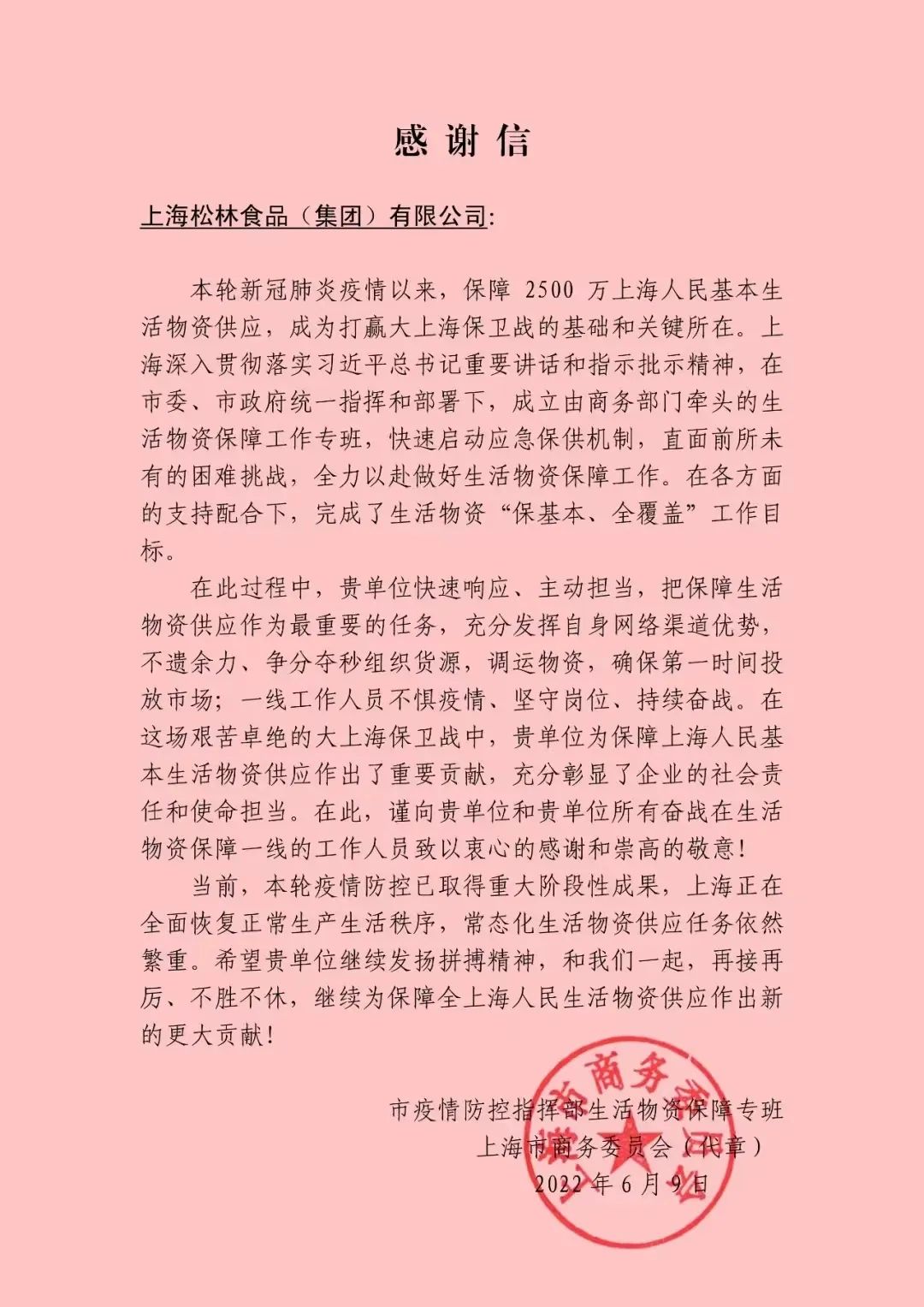 作为上海市本土食品龙头企业,松林食品集团急政府所急,解市民之需,被市民称为有良心的企业,有担当的企业,有前途的企业。