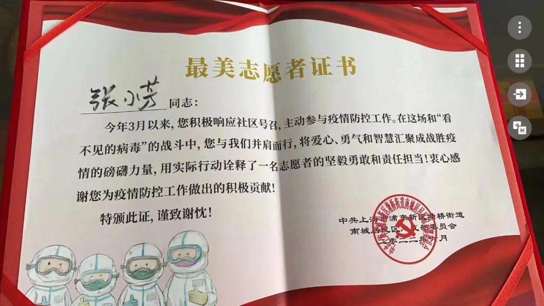 还有一件悠关人命的事例,那是在今年5月下旬,公寓9楼的洪阿姨突发心脏病,服药后仍未能控制病情。叫120救护车,要排好长的队,人命关天,怎么办?作为新华卫校毕业,曾在医院当过护士的张小芳,清楚地知道,黄金2小时是抢救急性心脏病患者的最宝贵时间。张小芳立马采用应急措施,及时拨打居委和街道电话,通过居委街道的应急救助通道,在最短的时间里,救护车飞快开到小区。当患者得知要送仁济医院时,病人和家属又犹豫了,因为他们听说在仁济医院就诊的病人,进去时核酸是阴的,但不久便转阳了,从而产生了顾虑。小芳就对家属说,离我们这里最近的对口医院只有仁济,如果担心被感染,我给你去送上面罩、N95口罩、医护专用手套和反穿服等,只要加强防护是不会有感染问题的。于是打消了病人的疑虑。就这样,在小芳的鼎力帮助下,洪阿姨在仁济医院的及时抢救之后病情终于转危为安。